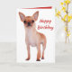 Ta en speciellare dag med den här roligten Chihuahua-valpen-hund. Kortet har en stilig brun och vit Chihuahua-valp med en Grattis på födelsedagen hälsning tryckt i ett fet rött teckensnitt som är markerat mot en skarp vit bakgrund.