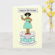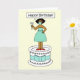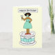 En tecknad av en afrikansk amerikan dam som bär en maskmask i ansikte som hon står på en gigantisk kaka. Dam säger "Grattis på födelsedagen" och bilden har en bakgrund av citronfärgaden.
