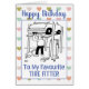 Däck Fitter arbetar med att reparera en bil. Bilreparationer. tecknad av ett Däck Fitter i en verkstad för reparation av fordon. Anpassa med dina egna detaljer och meddelanden. Säg Grattis på födelsedagen däck fitter.