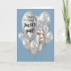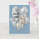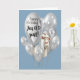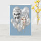 grattis på födelsedagen! Din gamla get!" i svart skrift, en illustration av en gammal get med ett melankoluttryck på hans ansikte på en ballong. Geten är omgiven av silver grått-ballonger. Ett roligt hälsningskort för någon speciell. Insidan av kortet är tom och vit.