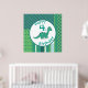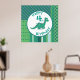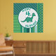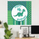 Lycklig leende dinosaurier i grönt/blå mönster bakgrund. Grattis på födelsedagen dino-väggkonst, poster.