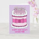En illustration av en vit kaka och en rosa som ställs in mot en god bakgrund av färgaden. Kakan är täckt av ljus med tänd rosa i blek och har en rosa buk bunden runt den. Ord "Grattis på födelsedagen dotter" följer med bilden.
