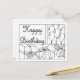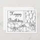 Denna vackra svartvita linjedragning är redo att färgläggas, för ett unikt gör-det-själv-sätt att fira en födelsedag. Detta kort har frasen "Grattis på födelsedagen" och en bild av presenter och ballonger.