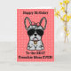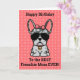 Frenchies, visa din Mamma lite kärlek på hennes födelsedag med ett kort för personlig från dig. På kortets framsida står "Grattis på födelsedagen till bästa Frenchie Mamma någonsin!" Inuti meddelandet står det: "I kärlek mer än behandlar du, Grattis på födelsedagen." Utformningen har en söt illustration av stil i tecknad av en kvinnlig fransk av blå färgad med en rosa båge och ett krage. Teckensnitt och bakgrund färg och ändras genom att klicka på "Klicka för att anpassa ytterligare".