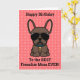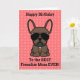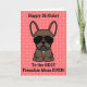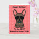 Frenchies, visa Mamma lite kärlek på födelsedagen med ett kort för personlig från dig. På kortets framsida står "Grattis på födelsedagen till bästa Frenchie Mamma någonsin!" Inuti meddelandet står det: "I kärlek mer än behandlar du, Grattis på födelsedagen." Utformningen har en söt illustration av en brun fransk av manlig färgad med en blå halsduk och en solglasögon för svart tecknad i stil. Teckensnitt och bakgrund färg och ändras genom att klicka på "Klicka för att anpassa ytterligare".