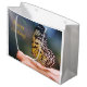 Den här stora presentväskan har en vacker bild av en vänskaplig fjärilslandning på en kvinnas hand.