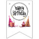 Denna girlang banner visar orden "Grattis på födelsedagen" i ett unikt tryck typsnitt med svarta bokstäver inuti en cirkulär design med födelsedagsdekaler i detta födelsedagstema och stil. Alla banners har enkelsidig utskrift utomhus säkra tillverkade av robust plast polystyren och tjock plast rep har (16) 5,5" x 8" svansklyvningsflaggor på en 6' lång sträng.