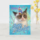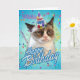 Kortet har Grumpy Cat i en party-hatt, med "Grattis på födelsedagen" på framsidan.