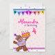 En färgstark, ljusstark nalle som håller en kaka, perfektens födelsedagsinbjudan till din lilla. All text kan ändras, utan extra-avgift! Klicka bara på Anpassa för att komma igång.