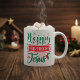 I detta festliga mugg deklareras "Grattis på födelsedagen Jesus" i rött och grönt helgdag med en sprit av holly- och snöflingor.