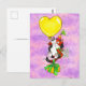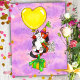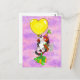 En söt kalikokatt, som har en festhatt på sig, och håller en bukett vita blommor i en tass, och håller en present med sin svans, dras upp i luften av en stor gul hjärtformad ballong. Bakgrunden är rosa och lila som en kvällshimmel.