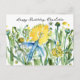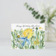 Personliga gratulationer på födelsedagen med en blå kolibri som besöker en ljusgul blomma i en sommarsommarträdgård, handritad med bläck och målad med akvarell.