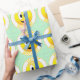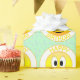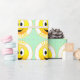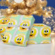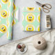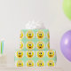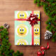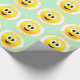 Sött Grattis på födelsedagen gult ansikte inslagningspapper. Stort runt gult glatt ansikte med orden Grattis på födelsedagen inslagna runt ansiktets kant. I bakgrunden är ett upprepat mönster av födelsedagskonfetti på en mintgrön bakgrund.