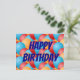 grattis på födelsedagen är i marinblå text. Bakgrunden är en mönster av ljusröda, gult och blå ballonger.