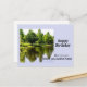 Bilden på framsidan av detta vykort är mitt fotografi av en lugn damm med träd helt i löv och gröna. De speglas i vattnet.