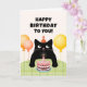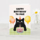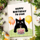Födelsedagskort med svart katt, födelsedagstårta och ballonger.