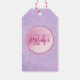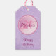 En märkre för födelsedagspresent. Födelsedagematodens utformning. En söt rosa-cirkel håller din anpassade namn och ålder. Bakgrunden är en lila av blek pastelllavender. Elegant och chic.