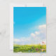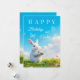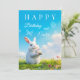 En söt vårscen med en söt kanin som håller en födelsedagstårta under en strålande blå himmel, med detaljerade påskdetaljer. Perfekt för att fira en födelsedag som infaller nära påsk med ett glatt kort.