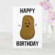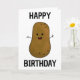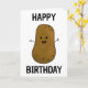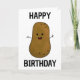 Cute lycklig brun tecknad potatis med stift arm, ett stort lycklig leende och prickar för ögon. På kortets framsida står "Grattis på födelsedagen" i svart text. Inuti kortet finns en mall där du kan lägga till ett eget meddelande för att anpassa.