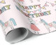 Grattis på födelsedagen med Grattis på födelsedagen i doodle brev i pastel färg och förskönad med punkter. Dörrbundet flaggor i alternerande färg och en tecknad kanin i en rosa klänning som innehåller en tulippblomma för en grått-enmajs.
