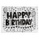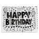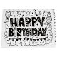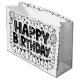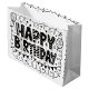 En vit presentpåse med svart text som lyder "Happy Birthday" och diverse svarta klotter. Påsen är tillverkad av blankt papper och har vita repsnören som handtag. Texten är fet och stiliserad, med varje bokstav fylld med olika mönster som stjärnor, prickar och ränder. Klottren inkluderar ballonger, stjärnor, cirklar och vågiga linjer, vilket skapar en festlig och firande design. Påsen är väl upplyst, vilket framhäver kontrasten mellan den vita bakgrunden och de svarta grafiska elementen.