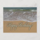 Vackert blåhav med vit vinkar- och sandstrand och Grattis på födelsedagen med typsnitt.