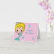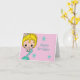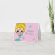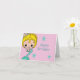 Färdfödelsedagskort för flickor med en grafik av en sjöjungfru med blondinskt hår med en blå klänning med 3 stjärnor på rosa bakgrund och talesättet Grattis på födelsedagen skrivet i ett tealteckensnitt. Anpassa dessa födelsedagskort med ditt eget speciella meddelande.