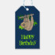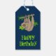 Grattis på födelsedagen är skrivet i ett glansteckensnitt för radgrönt. En söt teckning av en brun sluttning som klamrar sig till gren med löv, hänger upp och ned.