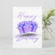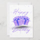 Denna inbjudan har orden "Grattis på födelsedagen" i ett unikt tryckfont som visar ljuslila färgade bokstäver plus två presenter inslagna med lila band och matchande konfetti genom hela bakgrunden i detta födelsedagstema och stil. Tryckt på ett klassiskt, runt papper 17,5 pt tjocklek med en obestruken mat finish med en äggskalstruktur tillverkad och tryckt i USA med "Grattis på födelsedagen" tryckt på baksidan.