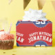 Röd, vit och blå - Den här sportiska och tävla rand-designen är perfekt för alla idrottsmän som spelar hockey, fotboll, fotboll eller baseboll. Du byter nummer till ditt lyckonummer eller till och med en speciell ålder för en födelsedagsfirande. En tålig och maskulin design med ett område för vilket årsdag som helst - 5, 50, 70 eller annat!
