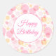 Stora runda grattis på födelsedagen-klistermärken visas med en festive rosa circles print. Anpassa eller köp som det är.