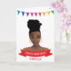 Grattis till din syster, flickvän. Färggradientbanderoll med svart kvinna som bär sitt naturliga hår och tillbehör till guld. Anpassa meddelandet på det röda menyfliksområdet och namn.