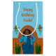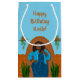 Grattis på födelsedagen! Den här utformningen har en kanavisk afrikansk skönhet med blå jacka och klädsel på en terra cotta-färgad med växter och blå bakgrund.