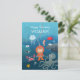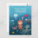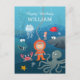 Det här söta Grattis på födelsedagen-vykortet har en modig liten dykarpojke som utforskar en undervattensvärld. Han är omgiven av olika undervattensdjur: bläckfisk, haj, krabba, maneter, koraller. Alla vattenlevande djur är mycket vänliga och leende. Underbart kort som ska skickas tillfälle på pojkens födelsedag, särskilt om barnet är intresserat av undervattensliv.