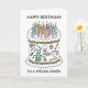 En stor födelsedagskalas som är täckt av flerfärgade belysta ljus och dekorerad med bilder av kakor, kokock, skedar, ugnshandskar, en mätsaft och en rullstift.