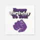 Dessa servetter visar orden "Grattis på födelsedagen till dig!" i ett fetstiltryck med lila och vita bokstäver med svart kontur och en pekande finger i detta födelsedagstema och stil. Vanliga servettstilar finns tillgängliga sålda i kvantiteter om 50, mäter 4,75"l x 4,75"b (vikta) tryckta i fullfärg.