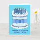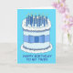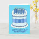 En stor tecknad blå och vit kaka täckt av ljus, inställd mot en baksida av turkos färgad. Ord "Grattis på födelsedagen till min tvilling" följer med bilden.