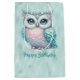 Här hittar du en mängd färgad glittery uggla på en glansig bakgrund av ett kontrasterande färg. Grattis på födelsedagen i en mörk av turkos är på framsidan, men det kan ändras till vad du vill.