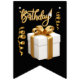 Denna buntingbanner visar ordet "Födelsedag" i en kursiv handskriven stilsnittsstil med guldbokstäver vit kontur med en födelsedagshatt, serpentiner och present i detta födelsedagstema och stil. Alla banners har ensidig utskrift utomhus säker tillverkad av robust plast polystyren och tjock plast rep har (16) 5,5" x 8" svansklyft flaggor på en 6' lång sträng.
