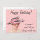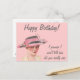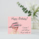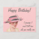 Det här vykortet har en vintage bild av en kvinna, på rosa. Texten lyder: "Grattis på födelsedagen! Jag lovar att jag inte ska berätta hur gammal du är verkligen."