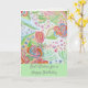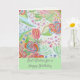 Grattis på födelsedagen-kort. Blomande blommar finns i den här lysande, fina blomdesignen. Koraller och blues snurrar i vatten.