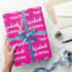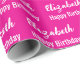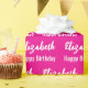 Det är shock rosa. Det finns en text mönster för mottagarens namn i ett skript och frasen Grattis på födelsedagen. Namn (Visa: Elizabeth) visas i ett elegant-skript. Texten är vit. All text kan redigeras.