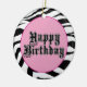 Randiga zebrakanter runt en rosa mitt med orden Grattis på födelsedagen.