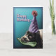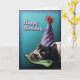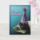 Illustration av en springer som tuggar en sko. Insida: Grattis på födelsedagentuggningen skor. Grattis på födelsedagentuggningen skor. Grattis på födelsedagen. Grattis på födelsedagen. Grattis på födelsedagentuggningen skor.