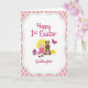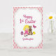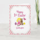 Framsidans design visar en ung blond flicka i en magenta klänning som sitter med ett milt leende, hennes kroppshållning är vänd något mot ett vänligt långörat brunt kanin 🐰 och en liten gul fågel som om de delar en tyst stund tillsammans. Ett randigt oval ägg i magenta och turkos vilar bredvid henne och tillför en festlig touch till scenen. Ovanför dem svävar en liten rödvingad insekt som ger en stunds rörelse till den mjuka färgpaletten. Illustrationen sitter i en stor yta med krämvit yta, infattad av en vågig kant med små prickade detaljer. Utanför ramen är bakgrunden fylld med mjuka rosa och beige diamanter arrangerade som en lätt rutig tyg. Överst visas en säsongsbetonad hälsning i slingrande magenta bokstäver, medan en kortare dedikationsrad i match