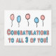 En rolig design för gratulationer vid graviditet visar meddelandet "grattis till er alla 3!" med några handritade ballonger ovanför - allt i rosa och blå färger.