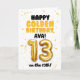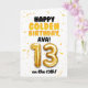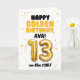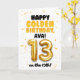 Fira att ditt barn fyller 13 på den 13:e med detta lyckliga gyllene födelsedagskort! Designat i ett ljust och glatt gyllene tema har detta kort en rolig och djärv layout med konfettidetaljer och en stor gyllene ballong i form av siffran. Personalisera det med ett namn på framsidan och på insidan av kortet för att göra deras gyllene födelsedag extra speciell!
