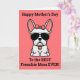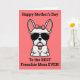 Franskbulldoggar, visa din mamma lite kärlek på mors dag med ett personligt kort bara från dig. Texten på framsidan av kortet lyder “Lycklig mors dag till den bästa franskbulldoggsmamman någonsin!" Texten inuti kortet lyder “Jag älskar dig mer än promenader, lycklig mors dag.” Designen visar en söt illustration i tecknad stil av en vit färgad fransk bulldoggstona som bär en rosa rosett och halsband. Typsnitt och bakgrundsfärg kan ändras genom att välja “Klicka för att anpassa ytterligare.”