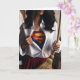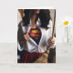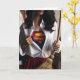 Grattis på mors dag med en kvinna som håller en sopkvast och en oknäppt skjorta med en superhjälte-kostym som tittar ut. Mamma är superhjältar!