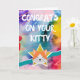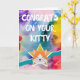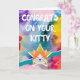 Grattis på ny katt, kattunge med guldstjärna, katt huvud, stor fet bokstav, och färgrik målning bakgrund. Konst, bild och vers copyright © Shoaff Ballanger Studios, 2022.